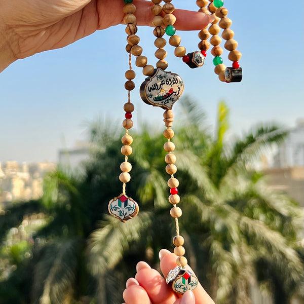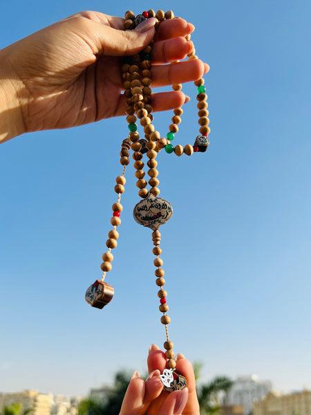سبحة مميزة من خشب الزيتون و حجر الملاكيت مع المرجان تحكي عن فلسطين مع قبة الصخرة و قوله تعالى : “ الا ان نصر الله قريب”
