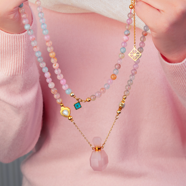 صنعت هذه السبحة من 100 حبة من المورجانايت و هو أحد الأحجار التي تنتمي إلى عائلة الزمرد والأكوامارين.. الفواصل والمأذنة طقم فضة عيار ٩٢٥ مطلي بال ذهب عيار ١٨